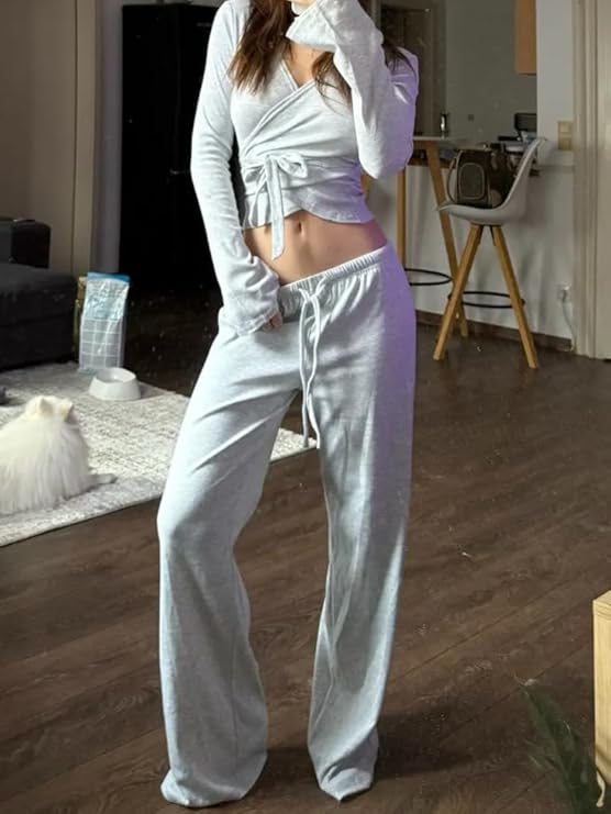 • Package: 1*top and 1*pants. Women y2K ballet wrap tops set 2 piece tie straps top tight pants set, casual tie front long sleeve shirt sets